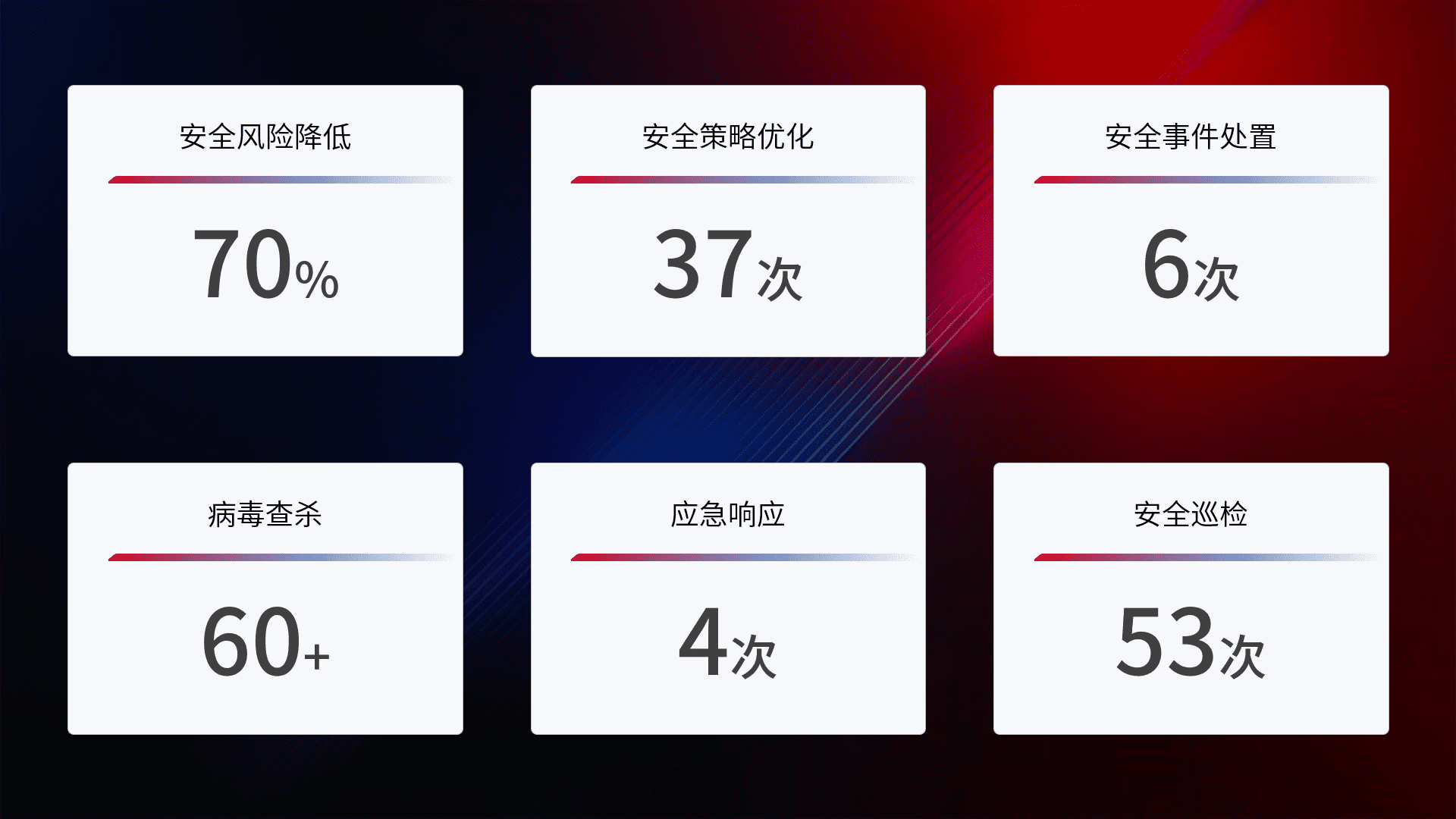 提供全面的安全事件报告体系,,,包括处置报告、、周报、、季度和年度总结,,结合持续监控,,,,帮助客户深入了解网络安全状况。。。。