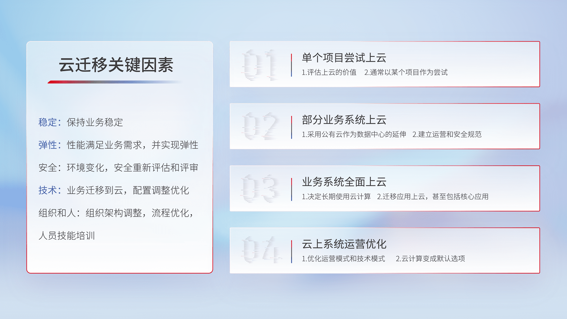 结合实际业务,,,从规划设计、、、云平台选型、、、云原生改造、、、数据迁移、、集成交付,,迁移全过程为客户识别最佳上云路径,,做好风险识别管理,,设计网络架构、、、身份权限、、、、安全审计合规、、操作审计、、、日志审计、、、、监控告警策略、、、多站点容灾设计等,,,对云上基础设施进行整体规划,,提升IT治理水平,,,,以满足弹性、、、、高可用、、、、高性能的需求。。。。